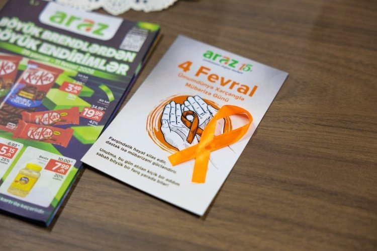 Resorting.Az xəbər verir ki, 4-11 fevral tarixlərində keçirilən maarifləndirici həftə çərçivəsində “Araz” supermarketlər şəbəkəsinin əməkdaşlarına narıncı yaxa nişanları təqdim olunub. Əməkdaşlar bu nişanları taxaraq xərçənglə mübarizə mövzusunda diqqət çəkib, həmrəylik nümayiş etdiriblər.